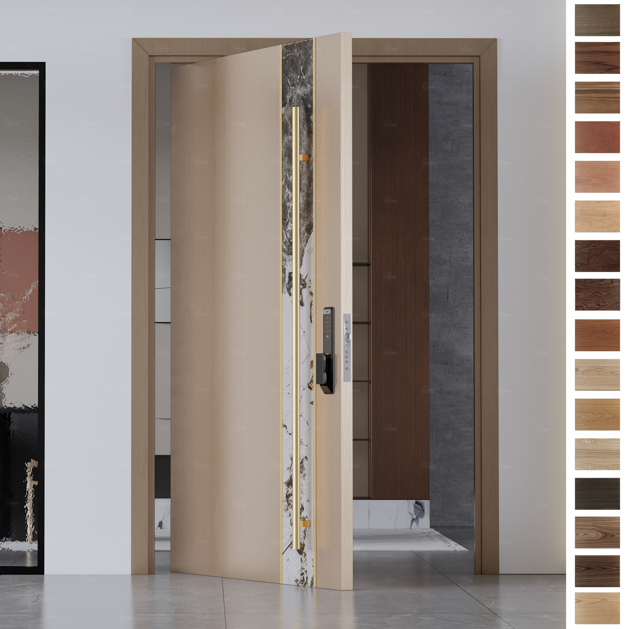 We offer a wide range of door options. Steel door panels provide high durability and robust protection against harsh weather conditions and external threats, while solid wood panels deliver a classic, elegant aesthetic. Each door showcases unique natural wood grain patterns. The composite material combines modern technology with traditional wood composites to ensure durability while remaining aesthetically pleasing and providing excellent sound insulation.