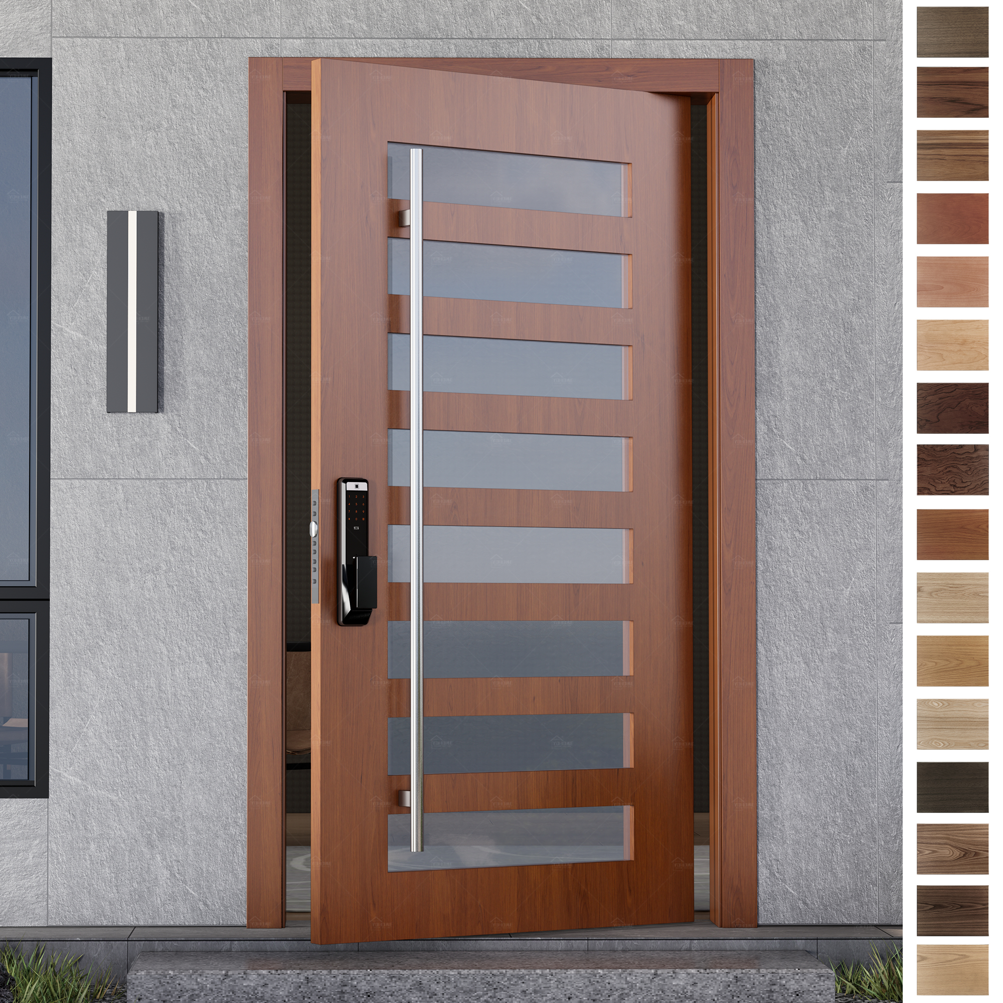We offer a wide range of door options. Steel door panels provide high durability and robust protection against harsh weather conditions and external threats, while solid wood panels deliver a classic, elegant aesthetic. Each door showcases unique natural wood grain patterns. The composite material combines modern technology with traditional wood composites to ensure durability while remaining aesthetically pleasing and providing excellent sound insulation.