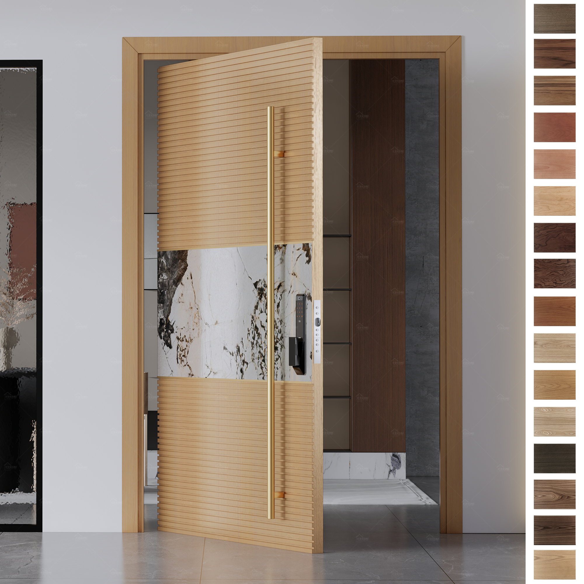 The door panel is the central visual and functional part of the entry door, typically constructed from wood, steel, etc. It directly influences the door's aesthetic appeal and performance, such as insulation and soundproofing. Whether flat, recessed, or carved, the door panel can be customized to suit a variety of architectural styles and personal preferences.